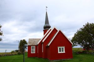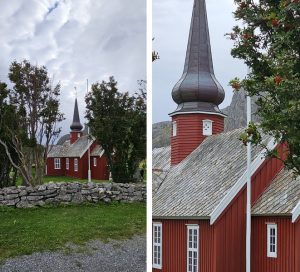 En retrait de la plage de Flakstad, l’église de Flakstad, avec son bulbe rouge, fut bâtie en 1780