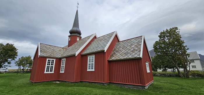 En retrait de la plage de Flakstad, l’église de Flakstad, avec son bulbe rouge, fut bâtie en 1780