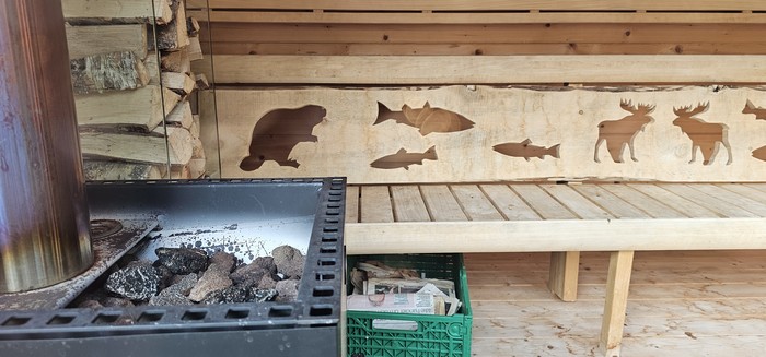 Il est grand temps de trouver un point pour la nuit, là aussi nous allons trouver notre petit coin de paradis , un camping façon trappeur, tout y est, le Husky,la tente laponne, avec du bois pour faire le feu, le sauna et son bain Nordique, le tout au bord d’un vaste étang.